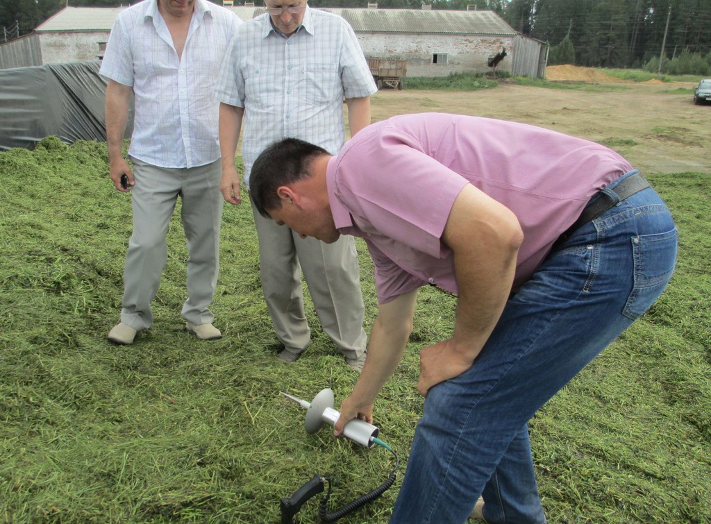 Директор «Пригородного» Ф.Н. Семиглазов пояснил, что в хозяйстве успешно завершены посевные работы, и в настоящее время полным ходом идет заготовка кормов - сенажа и сена. С учетом рекомендаций консультантов «КН» технологии – в целом - отработаны: заготовка сенажа из многолетних бобово-злаковых трав ведется с подвяливанием зеленой массы до 55-65%, сроки уборки по преобладающей культуре в травостое соблюдены (бутонизация - начало цветения, так как преобладающая культура - бобовая), длина резки и высота среза - в норме. На траншее работают 3 единицы техники. При проверке качества трамбовки термощупом температура сенажируемой массы была в пределах допустимых 36-37 градусов. При этом консервант вносится непосредственно в измельчаемую массу благодаря имеющемуся оборудованию на силосоуборочном комбайне. (В соответствии с районной сводкой на 2 июля в хозяйстве было уже заготовлено 15,6 ц/кормовых единиц на условную голову скота).